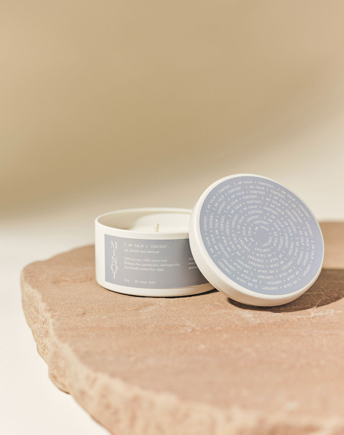 I am Calm + Content: Sage, lavender and cedarwood blend for a clean, calm scent. Place this candle in the hands of anyone who needs encouragement to own the energy they seek.