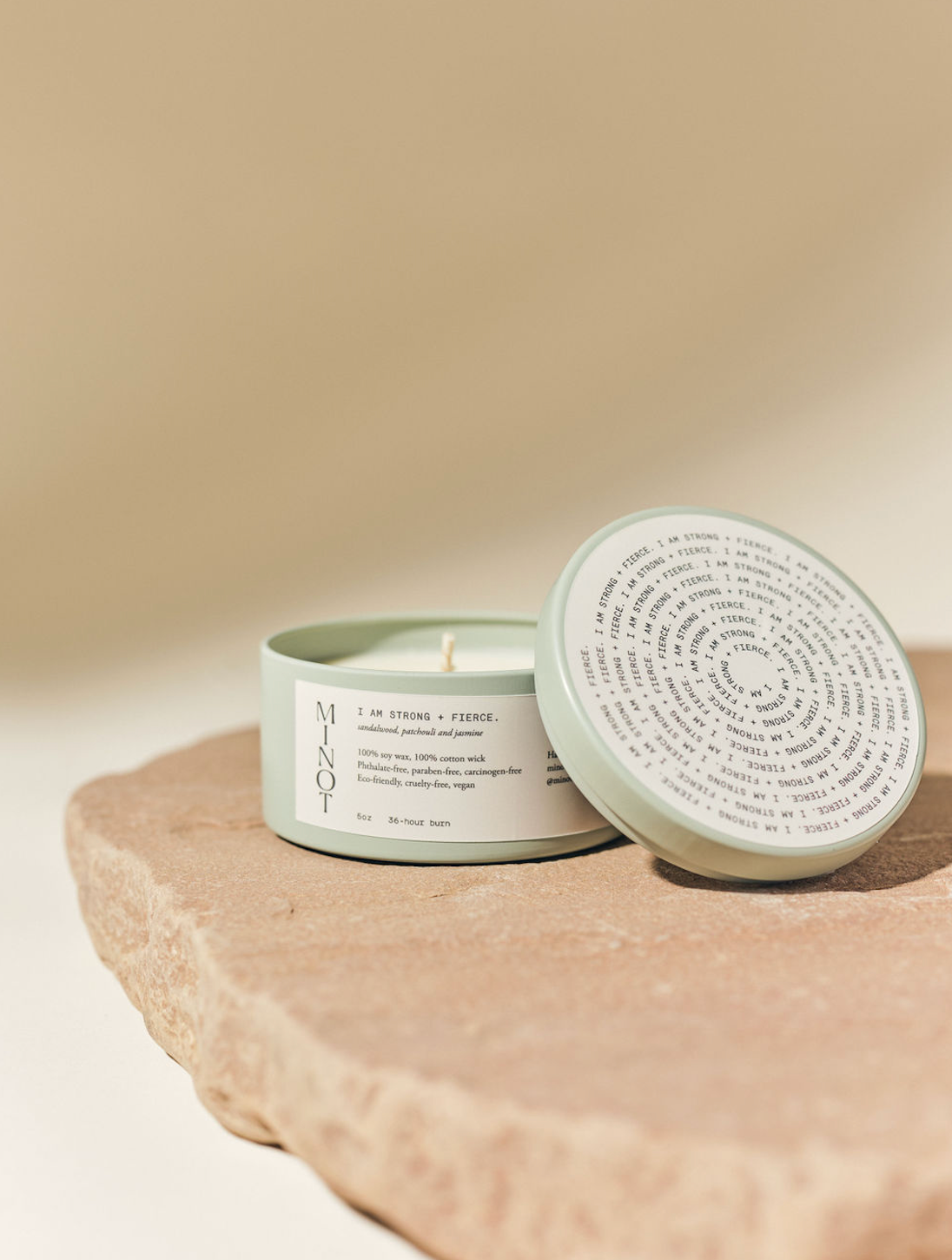 I am Strong + Fierce: Sandalwood, patchouli and jasmine blend for a warm, fierce scent. Place this candle in the hands of anyone who needs encouragement to own the energy they seek.